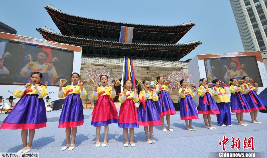 当地时间2013年5月4日,韩国首尔,崇礼门复原纪念仪式举行,总统朴槿惠着韩服出席。