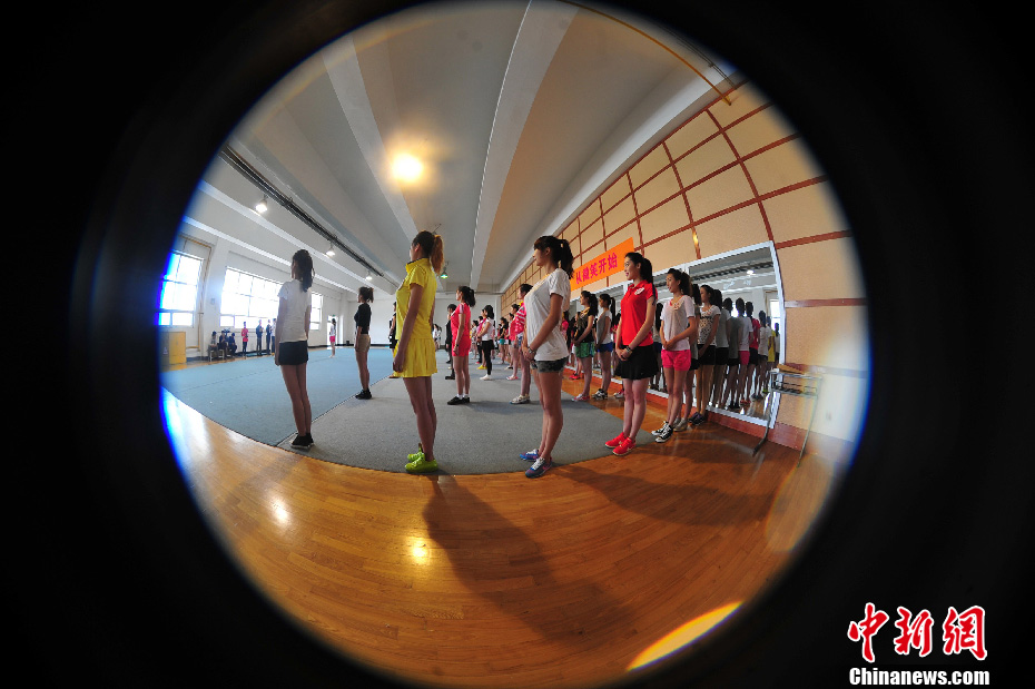 5月5日,全运会“靓丽风景线”候选人在训练礼仪基本功。当日,第十二届全运会开闭幕式和礼仪引导员候选人在沈阳体育学院第一次集体培训。中新社发 于海洋 摄