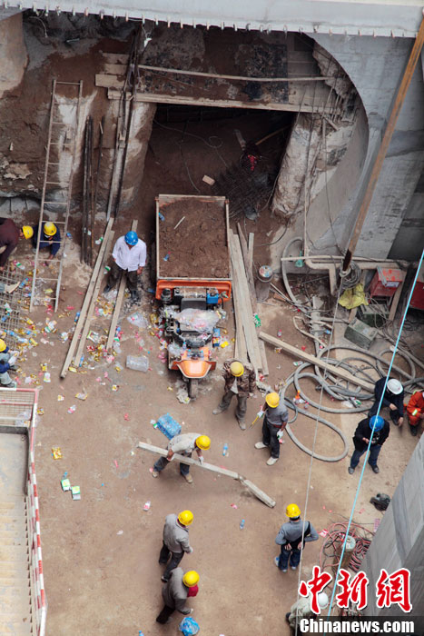 5月6日凌晨2时40分许,西安地铁三号线施工现场发生塌方事故,造成现场5名施工人员被困。陕西省公安消防总队向记者证实,目前已搜救出两名被困人员,但均已无生命体征。截止记者发稿时,现场救援仍在继续。图为地铁施工入口处。张远 摄