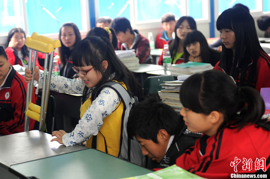5月6日,芦山中学全面复课,1000余名学生将在新的临时板房教室完成学业。据介绍,芦山中学的生源遍及芦山、宝兴、天全等地数十个乡,地震后,学校一共安装了20间板房教室、30间板房寝室、7间办公室,同时配套了厕所、浴室等。图为因地震受伤的高一(4)班学生邓梦雅在母亲的护送下,自己拄着拐杖上学。张浪 摄