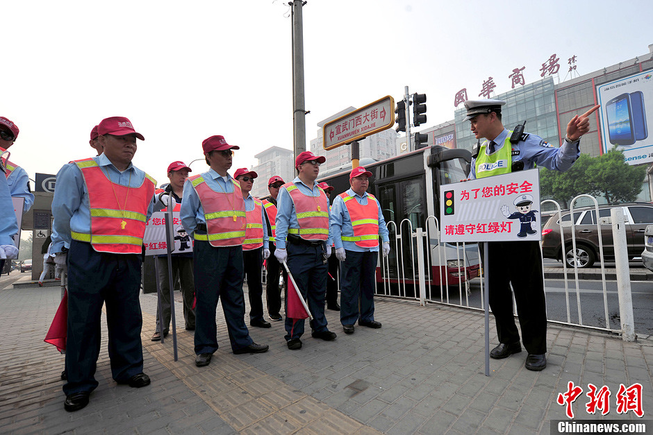 北京行人“闯红灯”开罚首日 “最帅交警”上路疏导