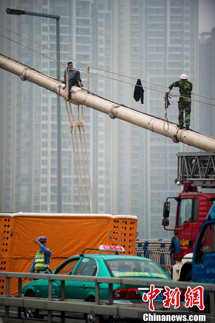 广州男子爬上桥索扬言跳桥 消防人员将其救下 (4/4)