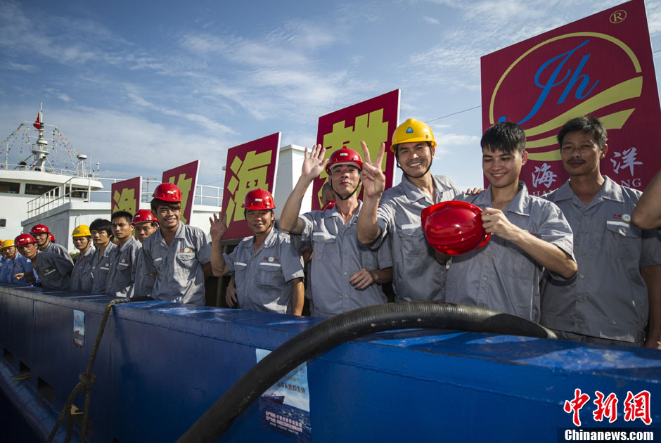 5月6日上午,海南省32艘渔船自发组成的捕捞船队,从海南岛西北部的儋州市白马井中心渔港出发,前往南沙捕捞作业。此次的船队以1艘4000吨级综合补给船为母船,出海时间预计约为40天,生产地点在北纬6度附近的三沙渔场,将采取拖、围、刺、钓等方式作业。图为即将远赴南沙作业的船员。中新社发 骆云飞 摄