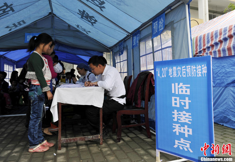 5月6日,为保护灾区民众身体健康,确保大灾之后无大疫,芦山强烈地震灾区首次开展疫苗群体性预防接种工作,并将持续到12日。此次预防接种工作是针对灾区18月龄至14岁的儿童免费接种1剂次甲肝灭活疫苗,对8月龄至14岁儿童免费接种1剂次麻腮风减毒活疫苗,以预防灾区甲型肝炎、麻疹、风疹、流行性腮腺炎的爆发或流行。中新社发 安源 摄