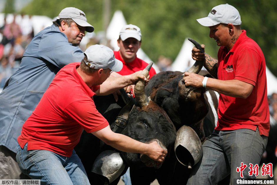 当地时间2013年5月5日,瑞士瓦莱州举办传统斗牛比赛,来自瑞士各地的母牛进行厮杀,竞逐“女王”宝座。