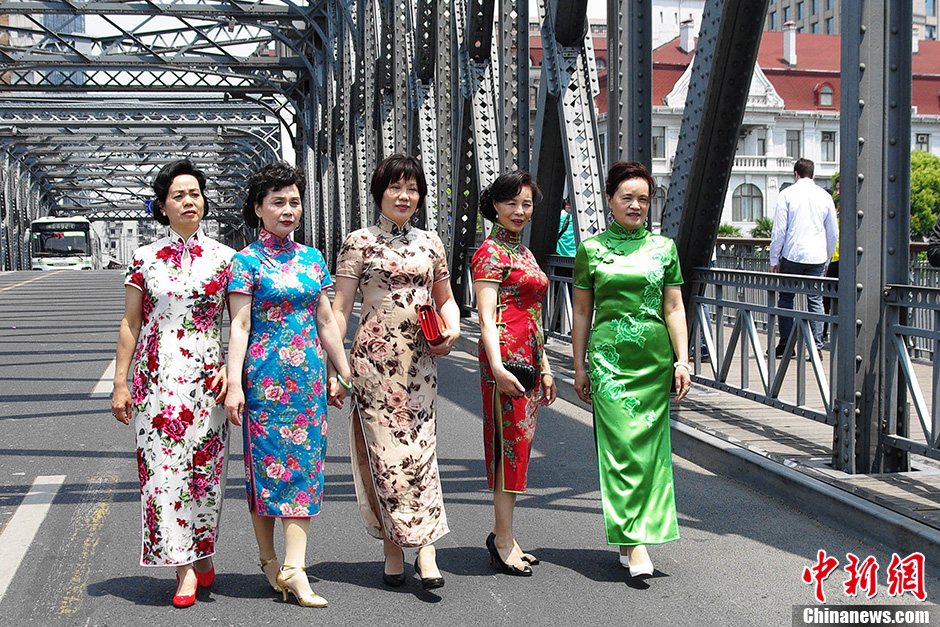 5月5日,几位中老年女士身着艳丽旗袍,在上海南京路步行街和外白渡桥上嫣然走秀。旗袍光彩照人,形态婀娜多姿,着实吸引了不少路人。据悉,3月23日,上海市民文化节正式开幕,全面展示近年来上海群众文化建设成果和市民文化风采,5月5日在南京路展示的中老年旗袍秀正是这个舞台上的一朵奇葩。 中新社发 王路得 摄 图片来源:CNSphoto