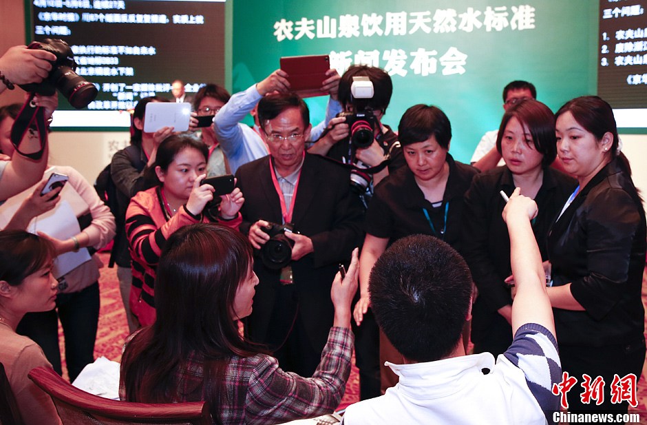 5月6日,农夫山泉在北京就产品标准问题召开新闻发布会,期间与《京华时报》记者进行了激烈争执,现场发言屡被打断。中新社发 刘关关 摄