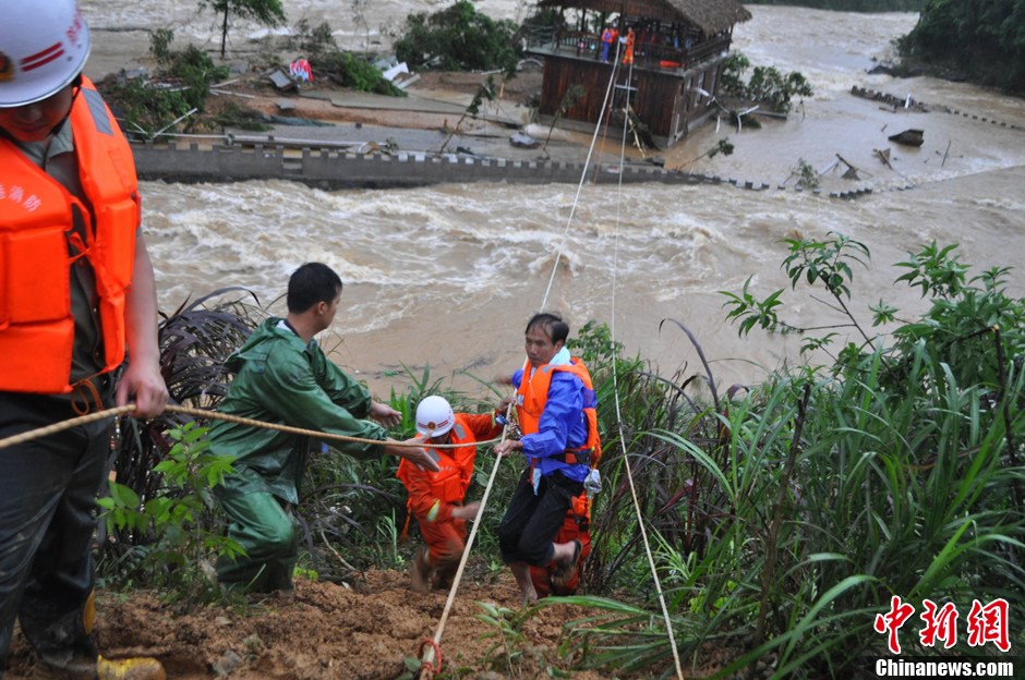 广西防城港突发山洪14人被困孤岛 现场紧急营救 (3/5)