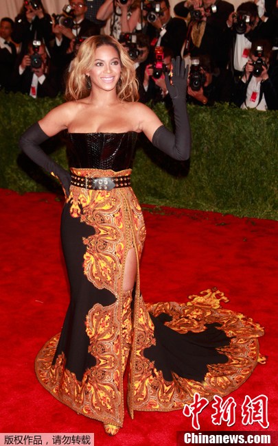 当地时间2013年5月6日,2013年MET BALL(纽约大都会时尚盛典)在纽约大都会艺术博物馆盛大举行。知名好莱坞明星、时装设计师、超级名模等各路时尚人士,纷纷身着华服踏上红毯,展开新一季的“时尚奥斯卡”争夺战。图为碧昂丝。
