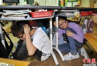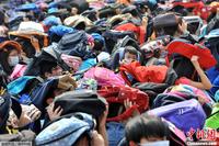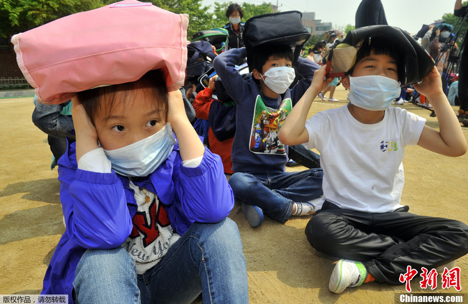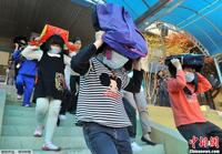 当地时间2013年5月7日,韩国首尔,小学生参加地震演习。图为小学生们将书包置于头顶保护头部。据称,韩国于5月6日至8日进行“安全韩国训练”活动,提高人们在自然灾害面前的防御能力。