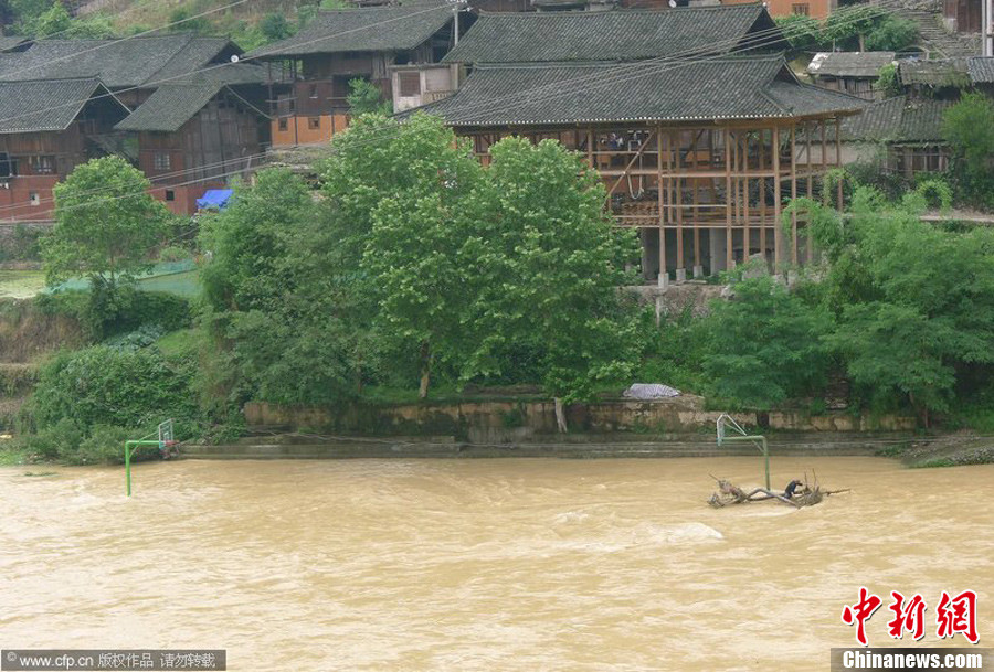 5月7日,贵州省凯里市遭受长时间强降雨,巴拉河流域河水上涨,多处苗寨度假村及一些苗族村寨遭受洪灾,暴雨还导致巴拉河沿岸局部发生泥石流,308省道公路出现多处坍塌。图为5月7日,三棵树镇季刀苗寨篮球场被淹没。陈沛亮 摄 图片来源:CFP视觉中国