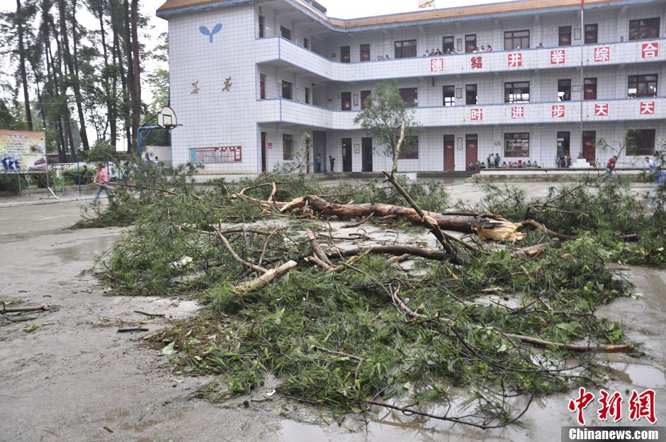 5月6日,贵州省遵义县龙坪镇遭遇雷雨夹冰雹及大风天气袭击,冰雹最大直径约2厘米,持续时间21分钟,导致1242.4公顷农作物受灾,668.3公顷灾至绝收,损坏房屋566.5间;大风致镇内11个养殖场圈舍受灾毁坏,面积达11000㎡,直接经济损失达956.2万元;镇属六个村(社区)均不同程度受灾,受灾人口16301人。图为当地学校操场内被大风吹断的树木。中新社发 肖莉莉 摄
