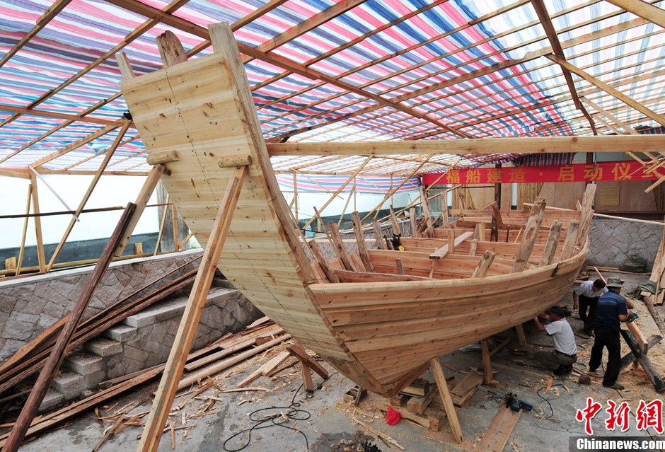 5月7日,在福州市中国十大历史文化名街三坊七巷福船文化馆,经过一个月的打造按1:0.7比例复原的福船已经颇具气势。从4月上旬开始,多名从福建全省召集来的非物质文化遗产传承人且有丰富造船经验的传统福船建造老师傅,被聘请至福建省福州市的中国十大历史文化名街三坊七巷福船文化馆,他们将用3个月的时间纯手工打造一艘“福船”。中新社发 张斌 摄