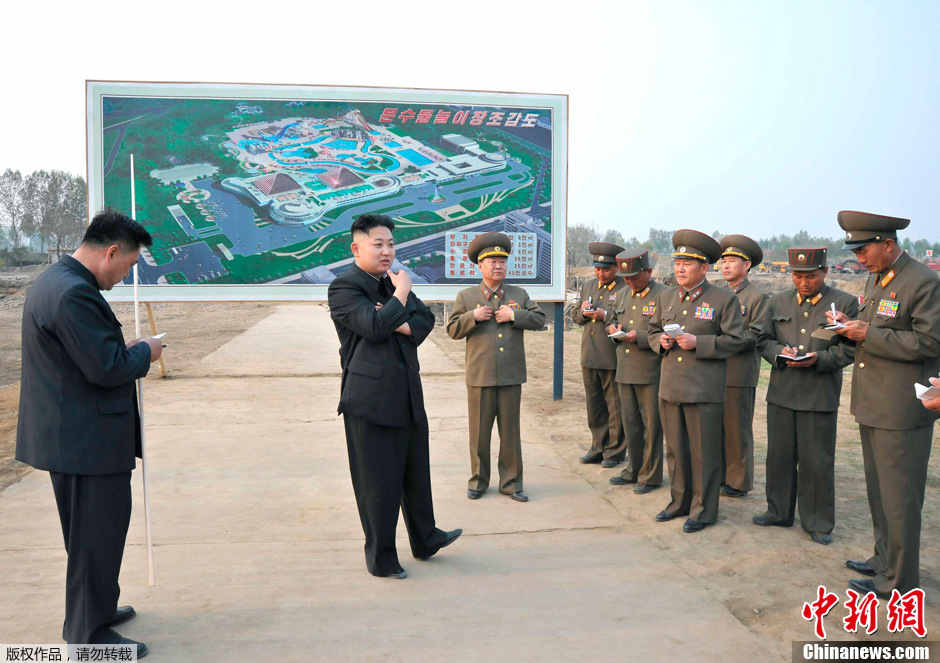 据朝中社2013年5月7日提供的照片显示,朝鲜最高领导人金正恩视察了朝鲜人民军承建的多个工程项目。