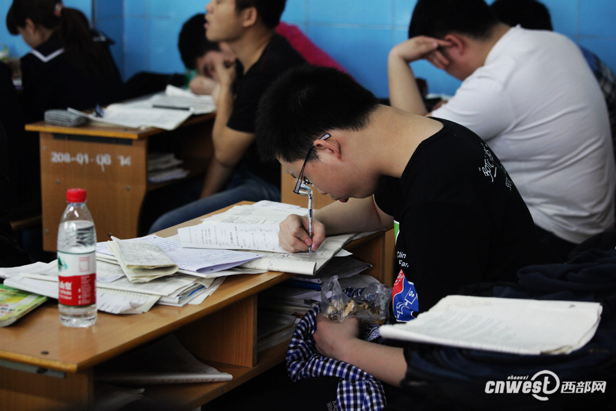 高三教室里,一位正在为高考全力冲刺的学生,一边学习一边加餐。图片来源:西部网