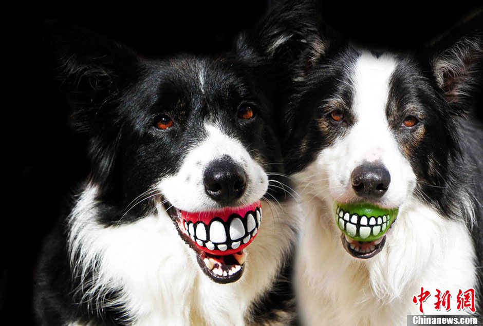 当地时间2013年1月30日,这是一款滑稽的新发明,含着它,全世界的狗狗都会冲你露齿微笑。这款狗狗玩具球由南美Rogz公司的Porky Hefer设计,上面带印有两排大白牙,保证汪星人每次屁颠屁颠跑过来都会送你一个由衷的微笑。图片来源:东方IC 版权作品 请勿转载
