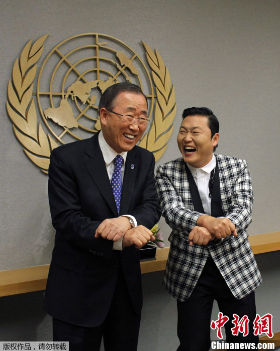 当地时间2012年10月23日,美国纽约,联合国秘书长潘基文在联合国总部会见大热神曲《江南style》的演唱者、韩国歌手“鸟叔”PSY,并一起大跳“骑马舞”,现场搞笑不断。
