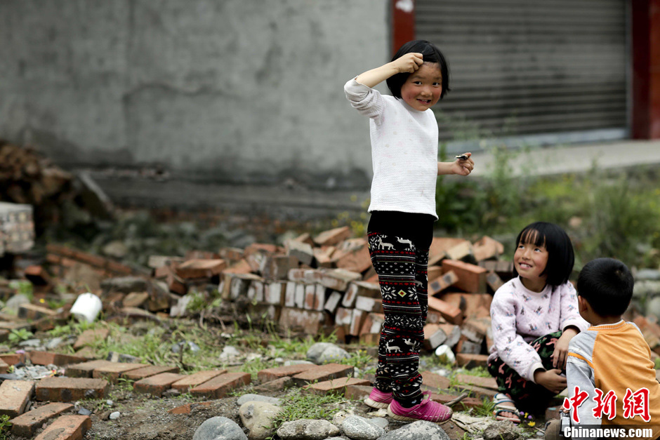 四川雅安芦山县龙门乡五星村的孩子们在地震灾害发生后,用坚强与乐观面对着巨大的灾情,他们用纯真的笑容展现了他们的勇敢。图为2013年4月24日拍摄的灾区的孩子们。中新社发 陆欣 摄