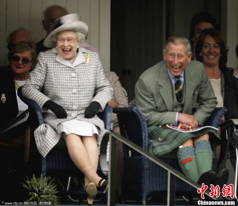 当地时间2006年9月2日,英国小镇Braemar,英国女王伊丽莎白二世和查尔斯王储观看布雷马集会比赛时笑开怀。图片来源:CFP视觉中国