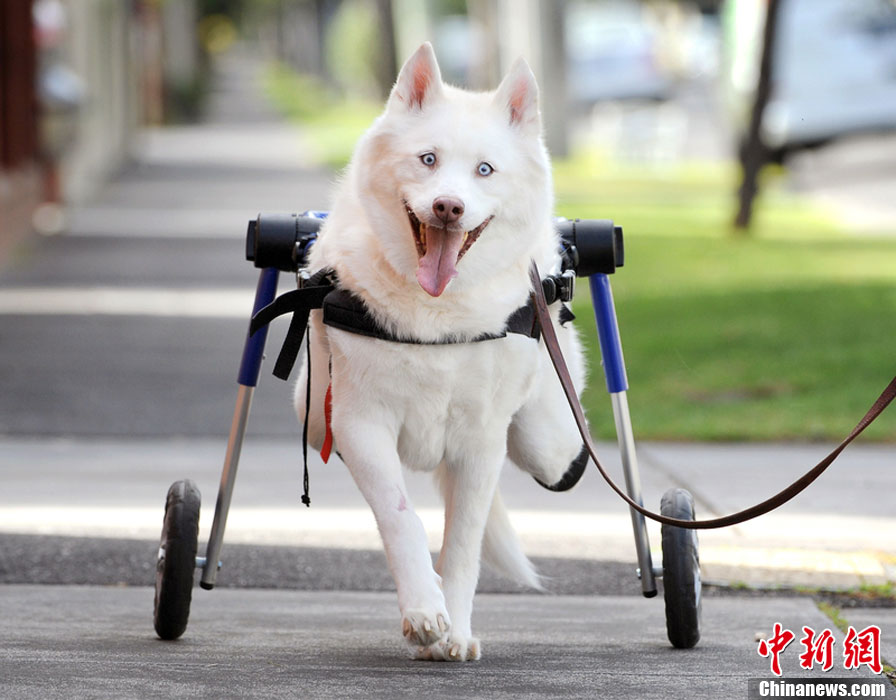 当地时间2012年4月11日,澳大利亚墨尔本,一只西伯利亚哈士奇狗狗装上了轮椅,开心的跑着。图片来源:东方IC 版权作品 请勿转载