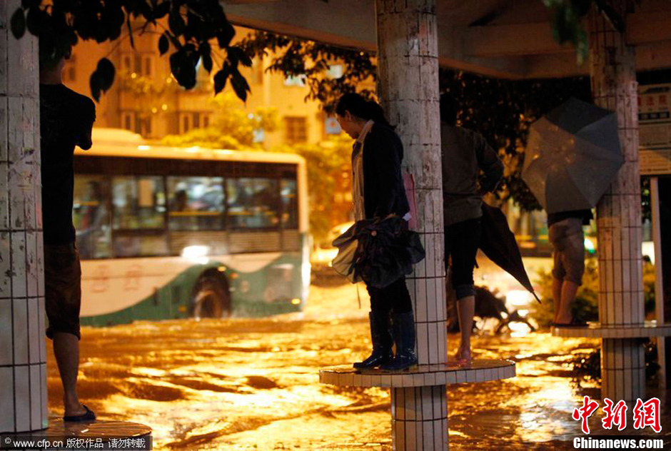 珠海暴雨内涝成“海” 公交站成“观海台”