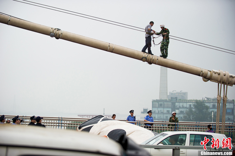 图为广州猎德大桥还未安装“刺网”时,5月6日上午10时许,一男子爬上广州猎德大桥扬言跳桥,警察及消防队员到场戒备。受此影响,猎德大桥南往北桥面的两条车道封闭近三小时,交通几近瘫痪。12时20分跳桥男子在消防人员帮助下走下桥索。中新社发 龙宇阳 摄