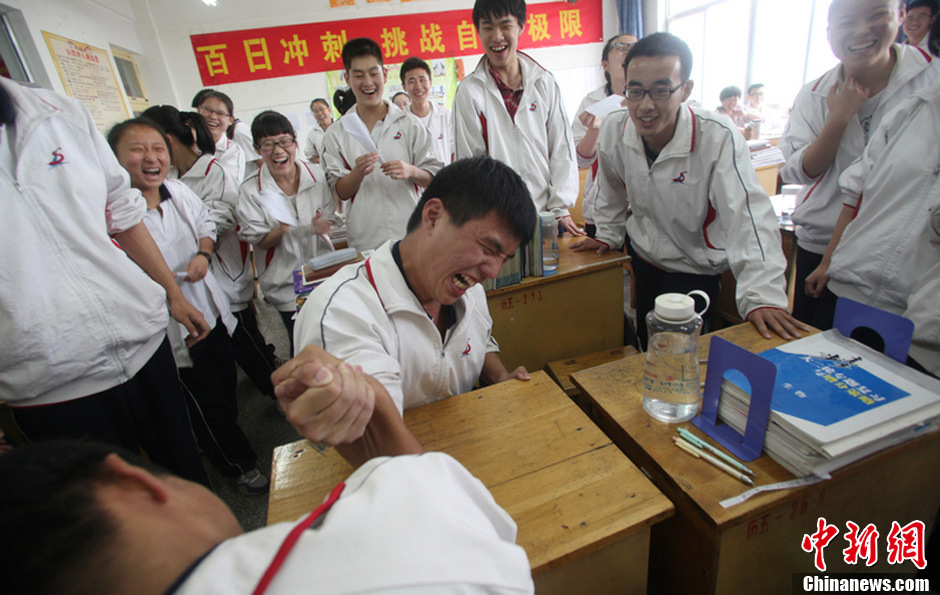 5月8日,山东济南,距离2013年高考还有30天,在省城历城五中高三教室里,考生们在教室里进行减压。据了解,高三考生们都全身心地投入到了备考中,有的考生甚至进入了“高压”状态。为此,学校老师让考生进行眼保健操,叠飞机,掰手腕,捉迷藏等降压游戏,让考生调整好心态减压备考。陈宁 摄 图片来源:东方IC 版权作品 请勿转载