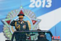当地时间5月9日,俄罗斯首都莫斯科红场举行盛大阅兵式纪念苏联人民伟大卫国战争胜利68周年。超过1.1万名官兵,百余件武器和军事装备亮相阅兵式。图为俄罗斯国防部部长谢尔盖·绍伊古检阅军队。图片来源:CFP视觉中国