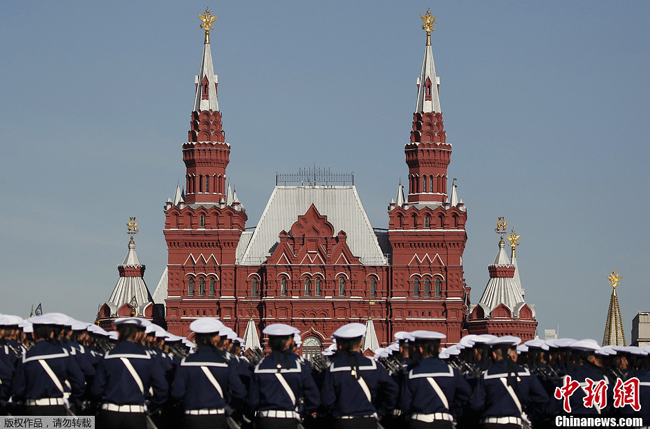 当地时间5月9日,俄罗斯首都莫斯科红场举行盛大阅兵式纪念苏联人民伟大卫国战争胜利68周年。超过1.1万名官兵,百余件武器和军事装备亮相阅兵式。图为俄罗斯海军受阅部队。