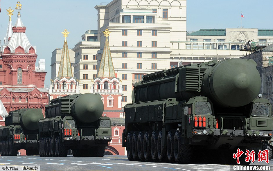 当地时间5月9日,俄罗斯首都莫斯科红场举行盛大阅兵式纪念苏联人民伟大卫国战争胜利68周年。超过1.1万名官兵,百余件武器和军事装备亮相阅兵式。图为俄罗斯“白杨”-M导弹通过检阅台。