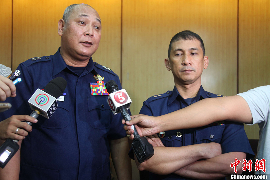 5月10日,菲律宾海岸警卫队召开记者会,首度公开对外承认是菲海岸警卫队人员9日开枪射击一艘台湾渔船,造成船上一名台湾渔民死亡。图为出席发布会的菲律宾海岸警卫队司令伊索雷纳(左)与发言人巴里洛(右)回答记者提问。菲海岸警卫队声称,菲方人员是先开枪警告,后又开枪射击船上机器设备。中新社发 张明 摄