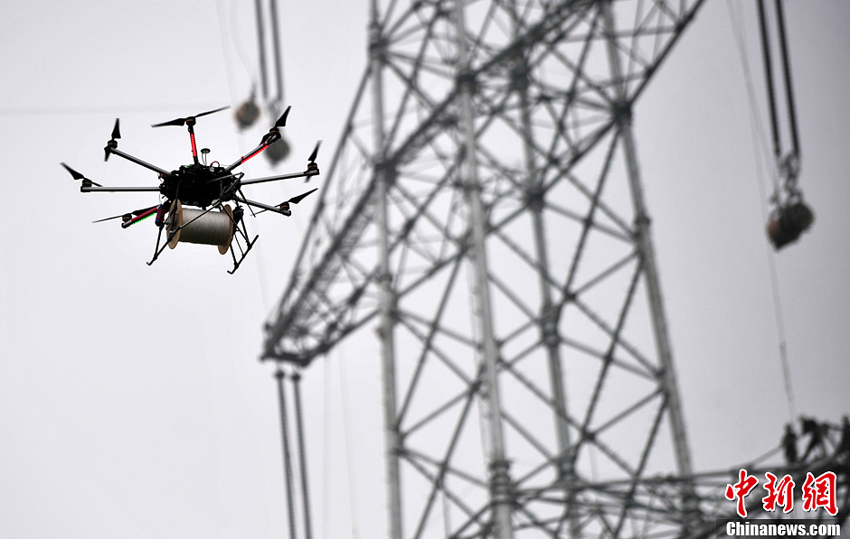 5月10日,在安徽省肥西县紫蓬镇长流村皖电东送1000千伏特高压输电线路工程第4标段施工现场,技术人员对多旋翼无人机进行试飞,为当天夜间跨合武铁路正式放线作准备。据了解,此次使用的多旋翼无人机有8只旋翼,装设有GPS导航仪,最大起飞重量15千克,最快速度12米/秒,一次起飞续航时间15分钟,具有可全天候使用、安全性能高、定位快速准确等特点,也是全国首台首次投入正式使用。中新社发 韩苏原 摄