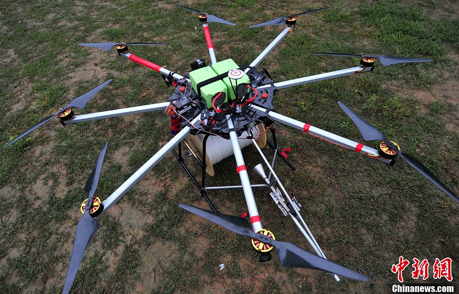 5月10日,在安徽省肥西县紫蓬镇长流村皖电东送1000千伏特高压输电线路工程第4标段施工现场,技术人员对多旋翼无人机进行试飞,为当天夜间跨合武铁路正式放线作准备。据了解,此次使用的多旋翼无人机有8只旋翼,装设有GPS导航仪,最大起飞重量15千克,最快速度12米/秒,一次起飞续航时间15分钟,具有可全天候使用、安全性能高、定位快速准确等特点,也是全国首台首次投入正式使用。中新社发 韩苏原 摄