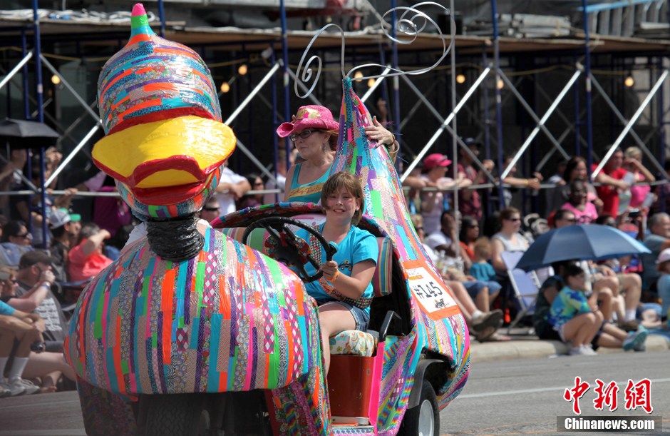 当地时间5月11日,第26届美国休斯敦艺术车游行在休斯敦市中心举行。共有来自全美23个州以及加拿大和墨西哥的近280辆经过装扮和改装的艺术车参加游行,奇思妙想的参与者投入几个月时间将爱车打造成一件艺术品,涵盖了环保、和平、健康、趣味等不同主题,吸引到超过25万名观众沿途观看。图为一辆用彩色胶带装饰的鸭子造型艺术车行驶在休斯敦艺术车游行队伍中。中新社发 王欢 摄