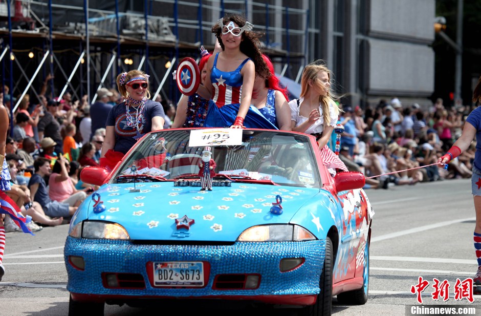 当地时间5月11日,第26届美国休斯敦艺术车游行在休斯敦市中心举行。共有来自全美23个州以及加拿大和墨西哥的近280辆经过装扮和改装的艺术车参加游行,奇思妙想的参与者投入几个月时间将爱车打造成一件艺术品,涵盖了环保、和平、健康、趣味等不同主题,吸引到超过25万名观众沿途观看。图为一辆被装饰上美国元素的艺术车行驶在休斯敦艺术车游行队伍中。中新社发 王欢 摄