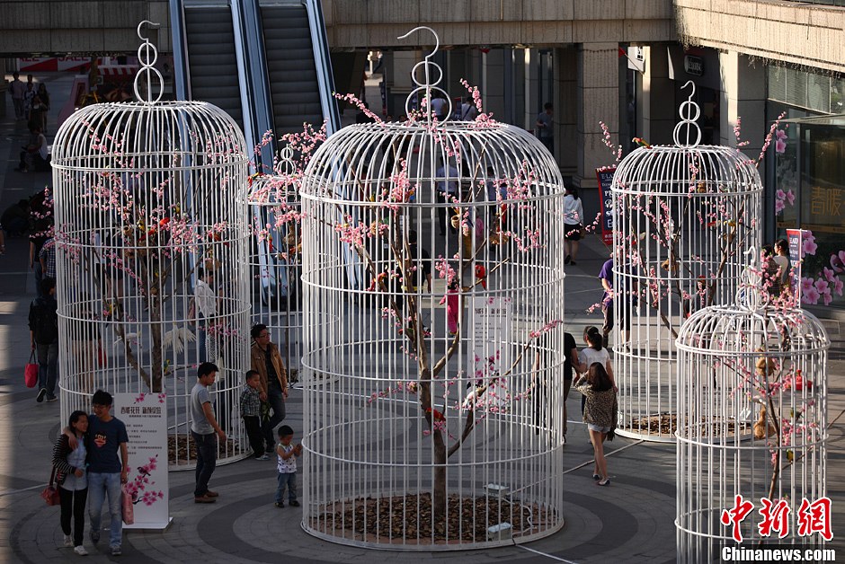 5月12日,在南京城东一处休闲广场内,6只巨大的鸟笼竖立其间格外抢眼,最高的有6米多,最小的也有3米多,鸟笼内放置着假花、假树和假鸟,以一种装置艺术的形式向民众宣传环保、崇尚大自然,倡导绿色生活。中新社发 泱波 摄
