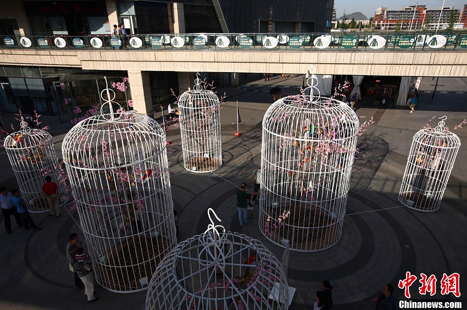 5月12日,在南京城东一处休闲广场内,6只巨大的鸟笼竖立其间格外抢眼,最高的有6米多,最小的也有3米多,鸟笼内放置着假花、假树和假鸟,以一种装置艺术的形式向民众宣传环保、崇尚大自然,倡导绿色生活。中新社发 泱波 摄
