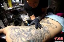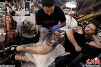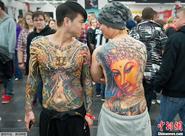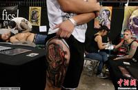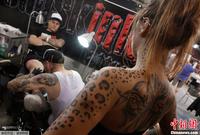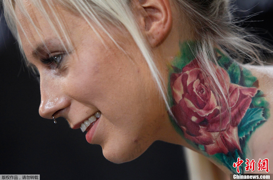 当地时间2013年5月12日,希腊雅典举行第7届雅典国际纹身大会。图为一名女子展示脖子上的纹身。