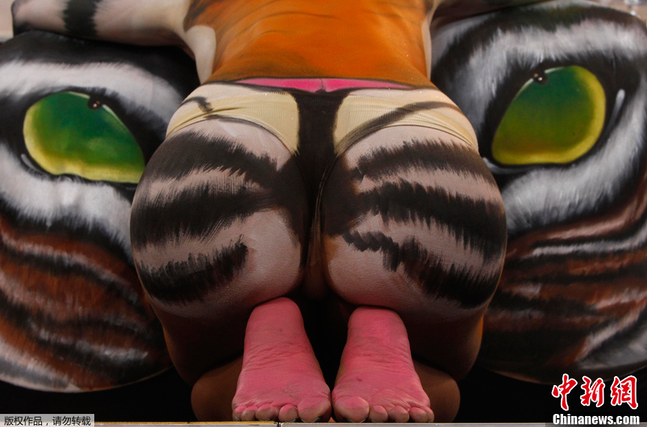 当地时间2013年5月12日,希腊雅典举行第7届雅典国际纹身大会。图为三名彩绘女子组合成老虎的模样。
