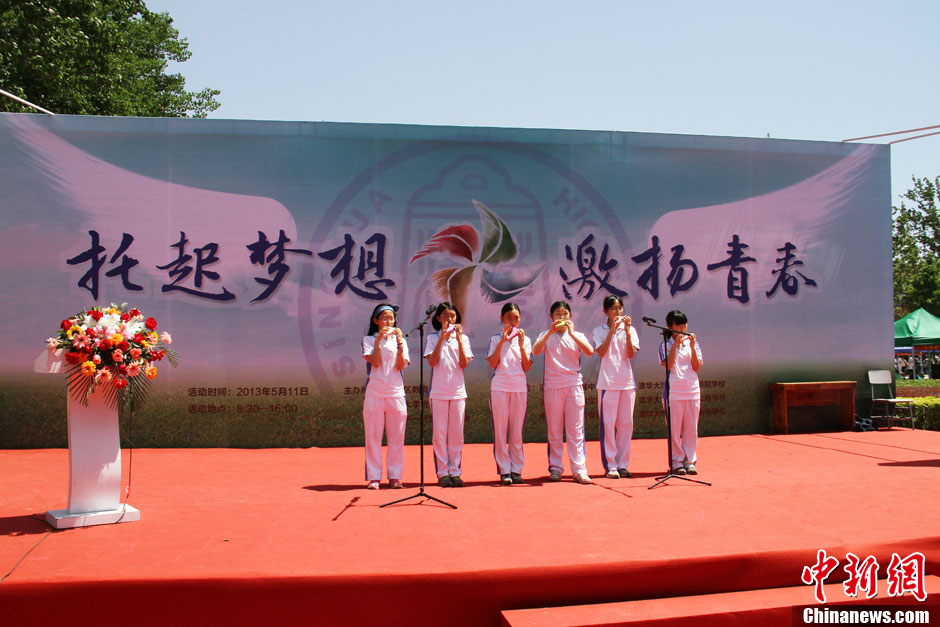 5月11日,清华附中举行了“托起梦想,激扬青春”2013学生节。学生节通过开展一系列活动为同学们营造一个自由展现的空间,激发同学们的创新精神,积极表现自我,展示出清华附中学生的精神风貌。图为清华附中陶笛社团的同学们在主舞台表演。