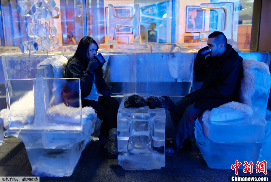 当地时间2013年5月12日,迪拜,人们在冰咖啡屋里喝热咖啡。这家冰咖啡屋是中东第一家冰屋,室内温度在零下6摄氏度。室内的所有装饰都是由冰块做成。