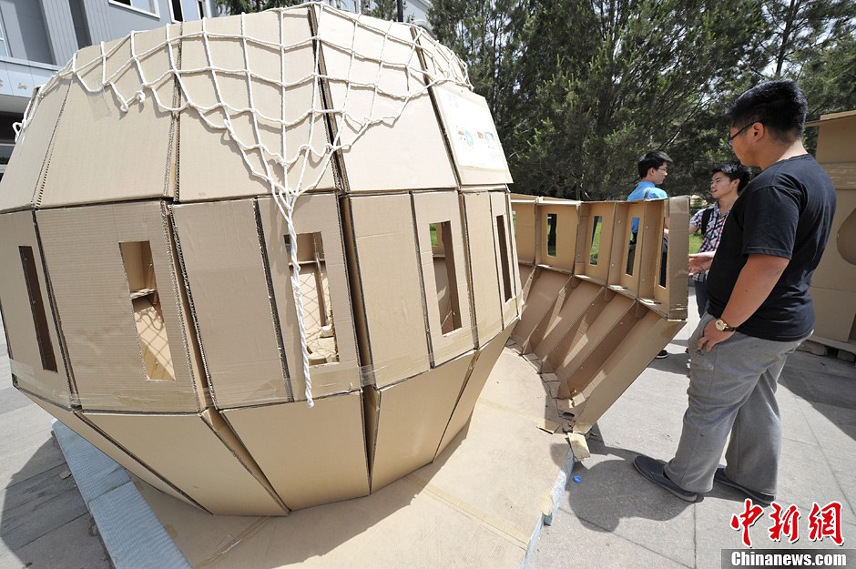 5月14日,在山西太原理工大学,学生们利用包装箱纸、塑料布等废旧用品为原材料进行设计,建造出许多造型新颖的“环保房屋”,吸引了不少大学生驻足观看。中新社发 韦亮 摄