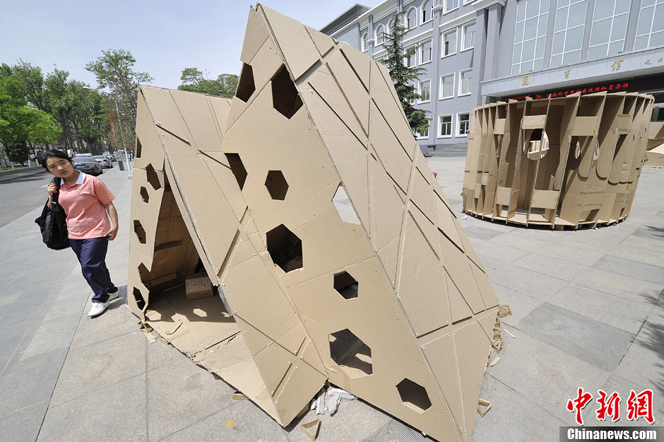 5月14日,在山西太原理工大学,学生们利用包装箱纸、塑料布等废旧用品为原材料进行设计,建造出许多造型新颖的“环保房屋”,吸引了不少大学生驻足观看。中新社发 韦亮 摄