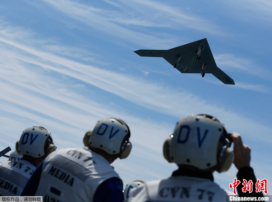 当地时间2013年5月14日,美国弗吉尼亚州,一架X-47B无人机从“布什”号航母上弹射起飞。这是美军首次完成了从航空母舰上弹射起飞无人机。