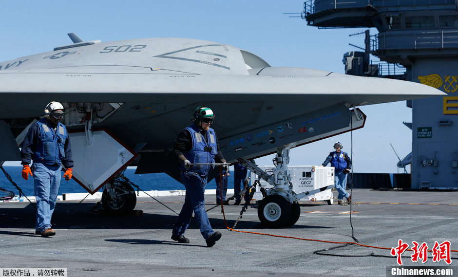 当地时间2013年5月14日,美国弗吉尼亚州,一架X-47B无人机在“布什”号航母上准备起飞。