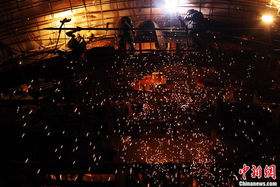 图为施工人员站在拱桥焊接钢架结构时火花四射。隧道每掘进一米,施工人员就会采用钢架结构对已经成的隧道进行加固。胡钟艺 摄