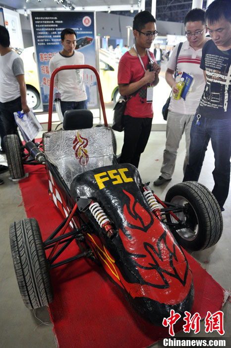 5月16日,在山西太原举办的一场车展上,来自中北大学的学生自制方程式汽车参展,与众多名车豪车同场竞技。虽然做工简陋,但该车以其承载的青春工业梦想,还是吸引了众多车迷的关注。中新社发 韦亮 摄
