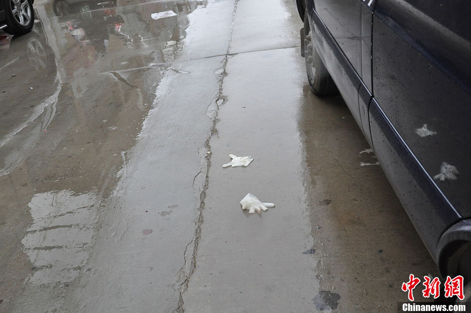 江苏镇江警方5月16日通报,当日上午,在镇江新区丁卯亿都建材城某银行门口,一名运钞车押运员在车内开枪自杀身亡。经调查,押运员在车厢内用配备的枪支朝头部开枪自杀,当即身亡,其“饮弹”原因尚不明。图为现场遗留的两只医用手套。陈洁 摄