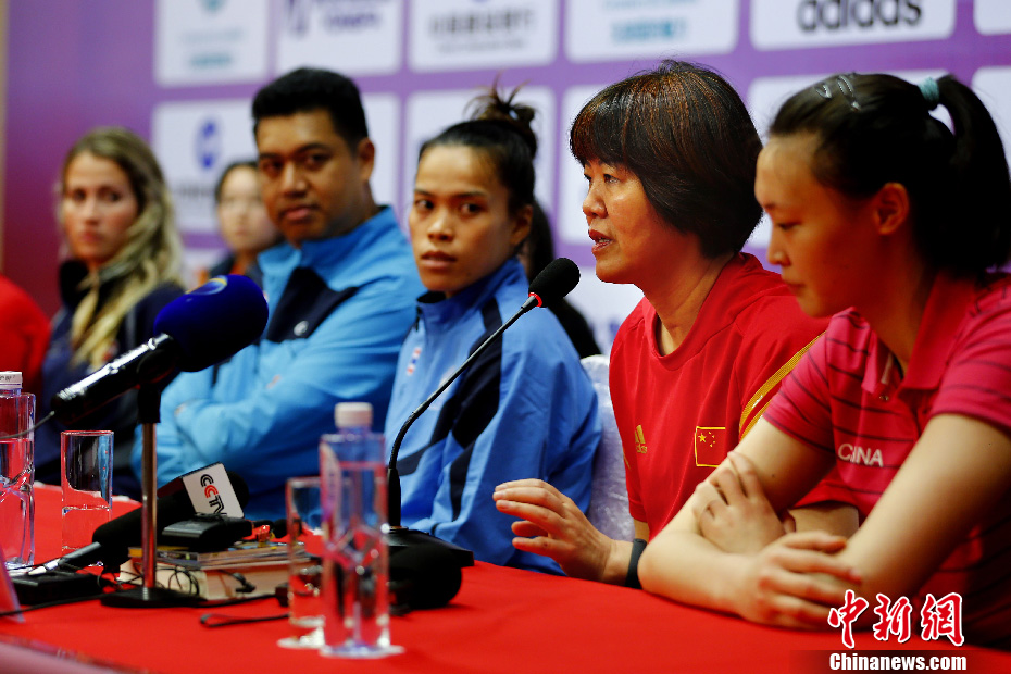 5月16日,中国女排主教练郎平(右二)率新任队长惠若琪,出席2013年中国国际女排精英赛新闻发布会。共有中国、古巴、波多黎各、泰国四支队伍参加此次比赛,赛事分两站进行,首站将于5月17-19日在浙江宁波北仑打响,22-24日将移师广东深圳。中国队首场将迎战波多黎各。中新社发 富田 摄