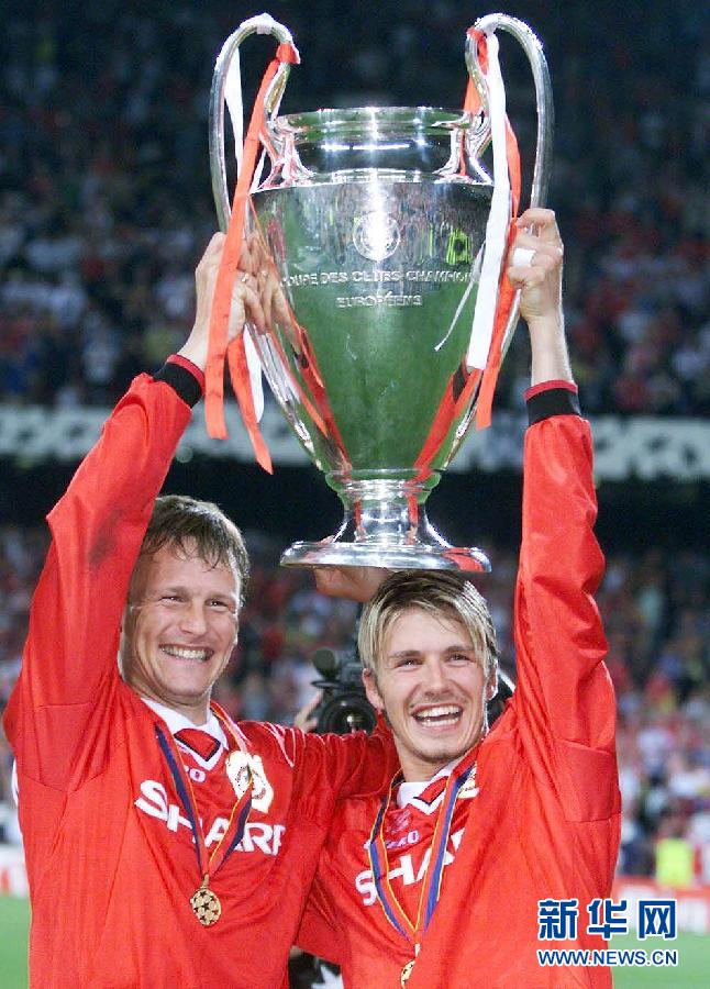 图为1999年5月26日,曼联队球员特迪·谢灵厄姆与大卫·贝克汉姆(右)在获得欧联杯冠军后高举奖杯庆祝。图片来源:新华网